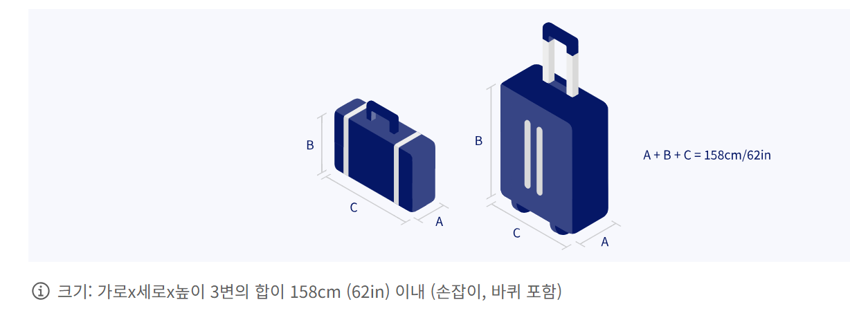 수하물의 크기는 가로, 세로, 높이를 합친 총 크기가 158cm 이내이어야 합니다. 예를 들어, 가로 50cm, 세로 60cm, 높이 48cm의 가방은 크기 제한을 초과하지 않습니다.