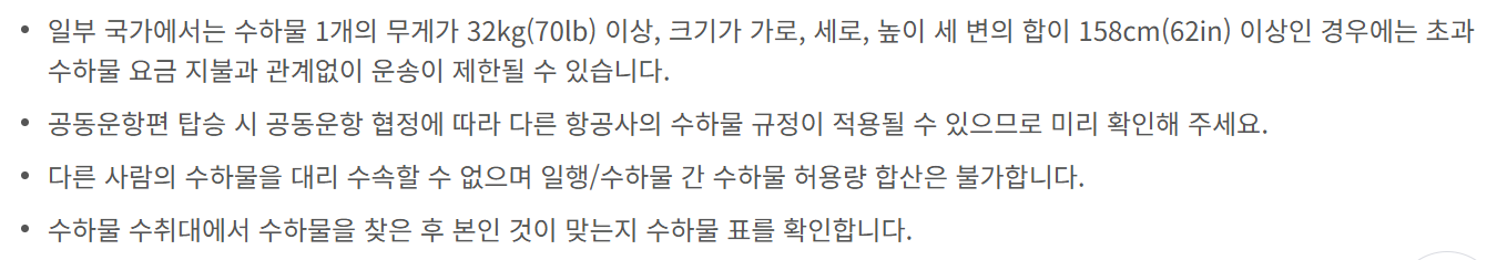 수하물 크기 초과 요금: 수하물의 크기가 158cm를 초과하는 경우, 추가 요금이 부과됩니다. 이때 요금은 항공사 정책에 따라 다를 수 있으며, 일정 크기 이상을 초과하면 수하물을 별도의 화물로 처리해야 할 수도 있습니다.